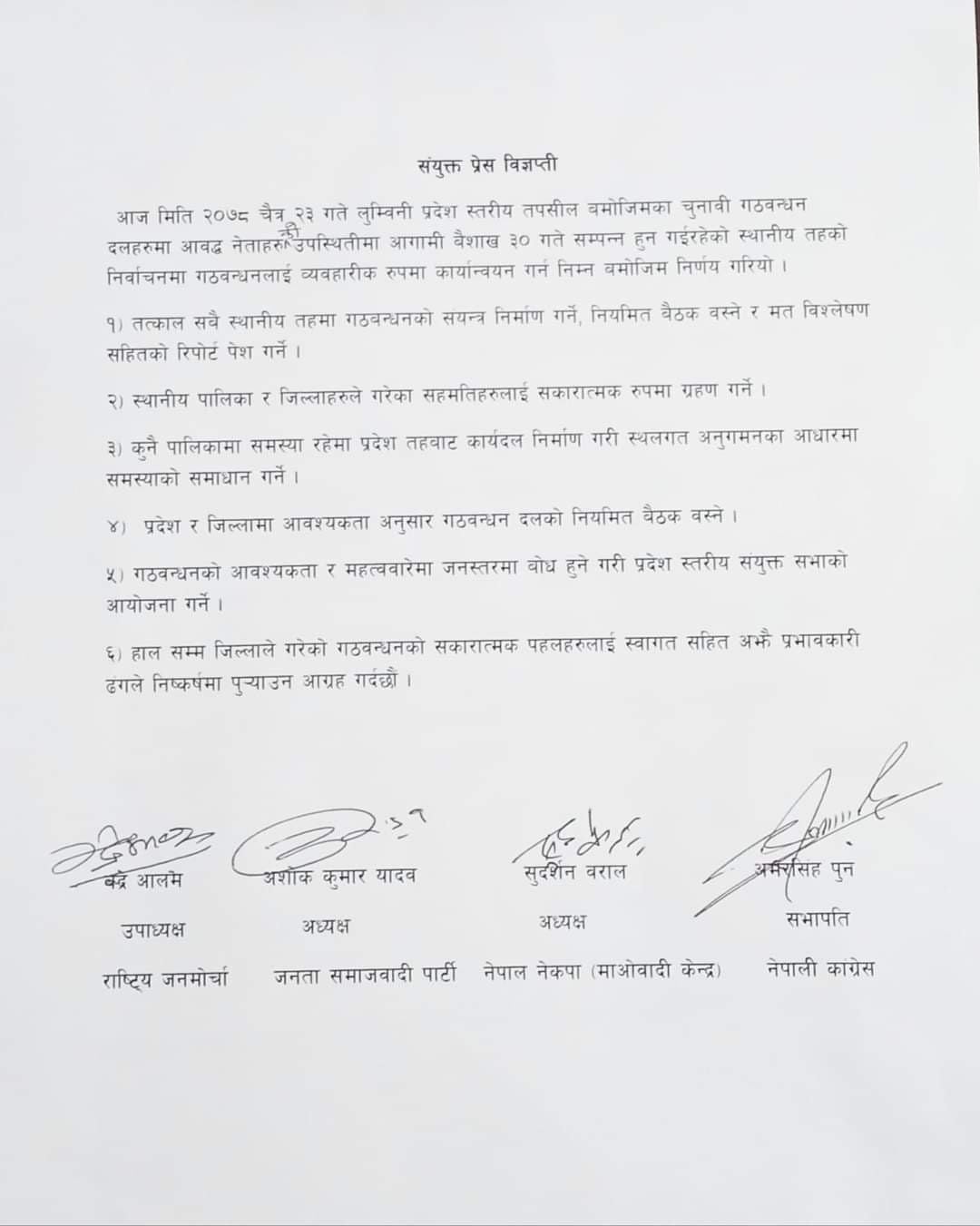 लुम्बिनी प्रदेशमा गठबन्धनका तर्फबाट सार्वजनिक गरिएको सहमति पत्रमा नेकपा एकीकृत समाजवादीलाई सहभागी गराइएको छैन । गठबन्धनको तर्फबाट सार्वजनिक गरिएको सहमति पत्रमा नेपाली कांग्रेसका प्रदेश अध्यक्ष अमरसिंह पुन, नेकपा माओवादी केन्द्रका प्रदेश अध्यक्ष शुदर्शन बराल, जनता समाजवादी पार्टीका अशोककुमार यादव र राष्ट्रिय जनमोर्चाका अध्यक्ष बद्रे आलमले हस्ताक्षर गरेका छन् ।