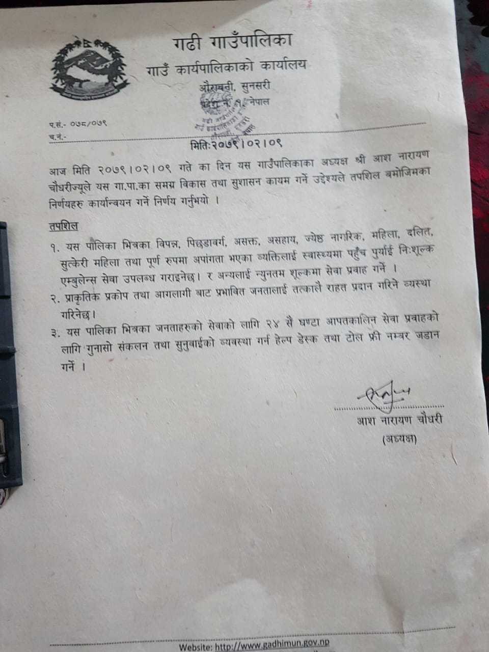 ‘गढी गाउँपालिकामा एउटै सुविधासम्पन्न स्वास्थ्य संस्था नहुँदा सामान्य उपचारका लागि पनि धरान, विराटनगर जस्ता सहरमा जानुपर्ने बाध्यता छ । तर, ती स्थानसम्म बिरामीलाई सहज रुपमा लैजान हामीसँग एम्बुलेन्स पनि नभएकोले आज मैले गढीबासीलाई स्वास्थ्य सेवामा पहुँच पुर्याउन एम्बुलेन्स सञ्चालन गर्ने निर्णय गरें ।’ पालिका प्रमुख अध्यक्ष चौधरीले भने ।