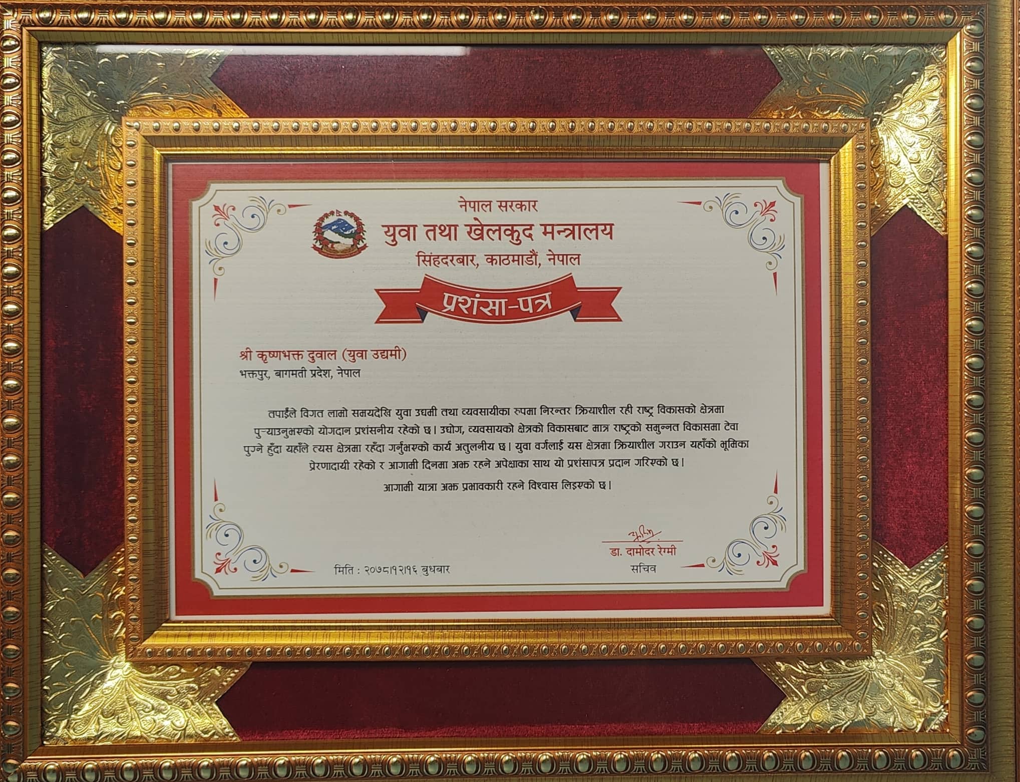 काठमाडौं, १२ असार । सरकारले भक्तपुरका इन्जिनियर कृष्णभक्त दुवाललाई सम्मान गरेको छ । लामो सयमदेखि युवा उद्यमी तथा व्यवसायीलाई आन्टप्रोनर्स (स्वावलम्बी) बनाउन गरेको योगदानको कदरस्वरूप युवा तथा खेलकुद मन्त्रालयले उनलाई सम्मान गरको हो । मन्त्रालयका सचिव डा. दामोदर रेग्मीले इन्जिनियर दुवाललाई प्रशंसपत्र प्रदान गरी सम्मान गरेका हुन् ।