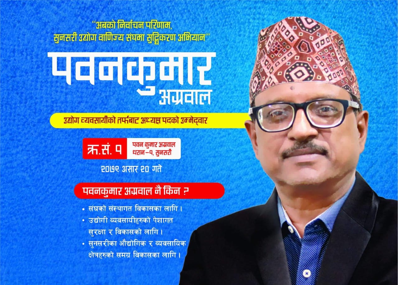 देशभर स्वतन्त्र उम्मेदवारको लहर चलेसँगै सुनसरी उद्योग वाणिज्य संघको असार २० गते हुन गइरहेको निर्वाचनमा व्यवसायी पवन अग्रवालले पनि स्वतन्त्र उम्मेदवारी दर्ता गराएका छन् । झण्डै ३० वर्षदेखि सुनसरी उद्योग वाणिज्य संघमा रहेर एक कार्यकाल अध्यक्ष तथा त्यसअघि कार्यवाहक अध्यक्ष भएर कुशलतापूर्वक संस्थालाई नेतृत्व दिएका अग्रवालले संघ भित्र पछिल्लो समय देखिएको राजनीतिक विकृतिविसंगति विरुद्ध स्वतन्त्र उम्मेदवारी दिएको जिकिर गरेका छन् ।