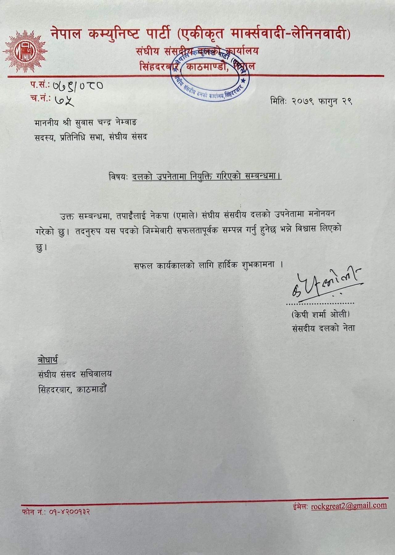 ओलीले आइतबार संसदीय प्रमुख सचेतकमा पदम गिरी र सचेतकमा महेश बर्तौलालाई मनोनीत गरेका थिए । नेम्वाङ राष्ट्रपतिका उम्मेदवार थिए । उनी नेपाली कांग्रेसका उम्मेदवार रामचन्द्र पौडेलसँग पराजित भएका थिए ।