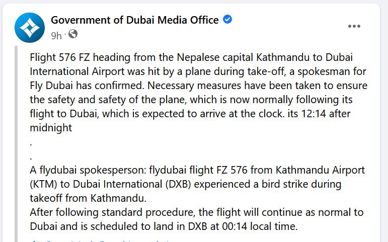 फ्लाई दुबईले जहाजमा चरा ठोक्किएका कारण आगोको झिल्का देखिएको र ठूलो आवाज आएको बताएको दुबई मिडिया अफिसले जनाएको छ ।