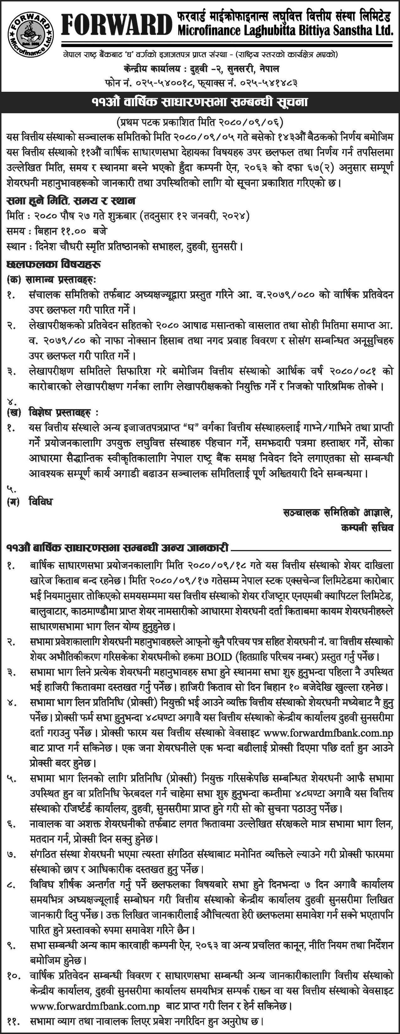 सुनसरी । फरवार्ड माइक्रोफाइनान्स लघुवित्त वित्तीय संस्थाले वार्षिक साधारण सभा बोलाएको छ । संस्थाले पौष २७ गते ११ औं वार्षिक साधारण सभा बोलाएको हो । संस्थाले एक सूचना प्रकाशित गरी कम्पनी ऐन २०६३ को दफा ६७ (२) अनुसार वार्षिक साधारण सभा बोलाएको हो ।