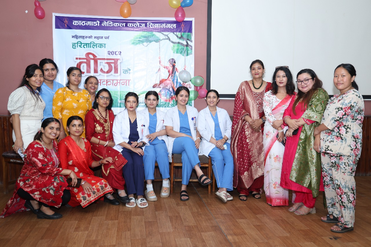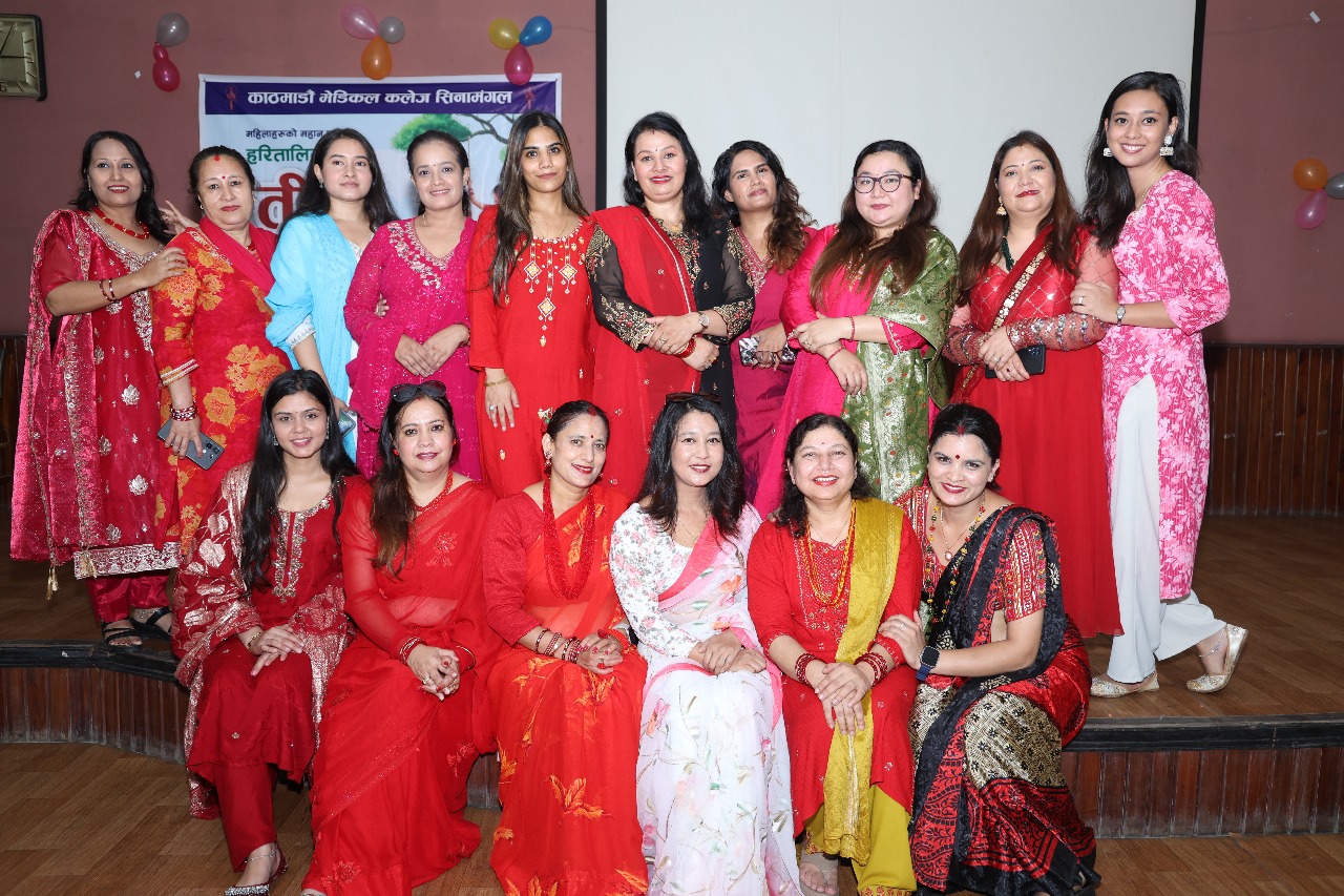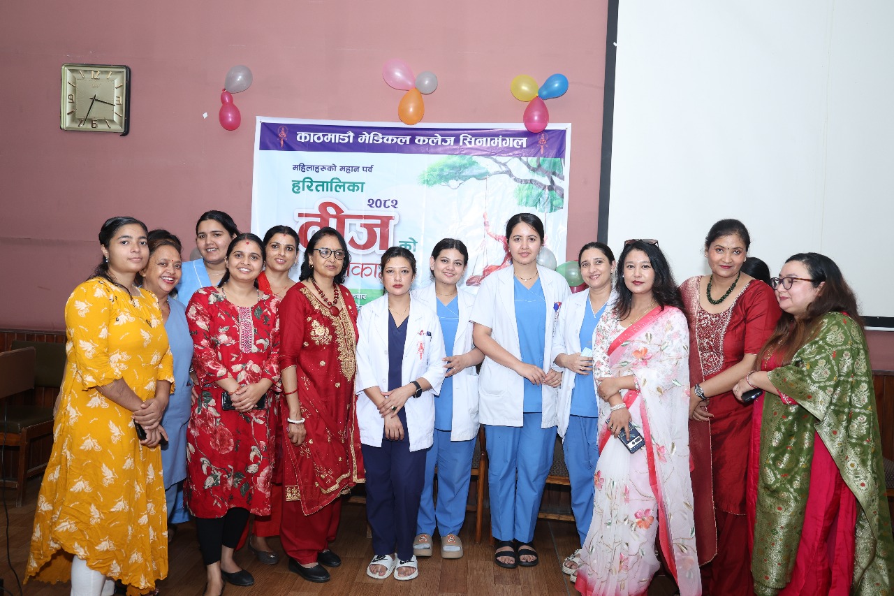 काठमाडौं । काठमाडौं मेडिकल कलेज (केएमसी)ले तीज पर्वको अवसरमा विशेष कार्यक्रम आयोजना गर्दै कार्यरत महिला चिकित्सक, नर्स तथा कर्मचारीहरूलाई दर खुवाएको छ । शुक्रबार कलेज परिसरमा आयोजित कार्यक्रम सांस्कृतिक र उत्साहपूर्ण वातावरणमा सम्पन्न भएको हो ।