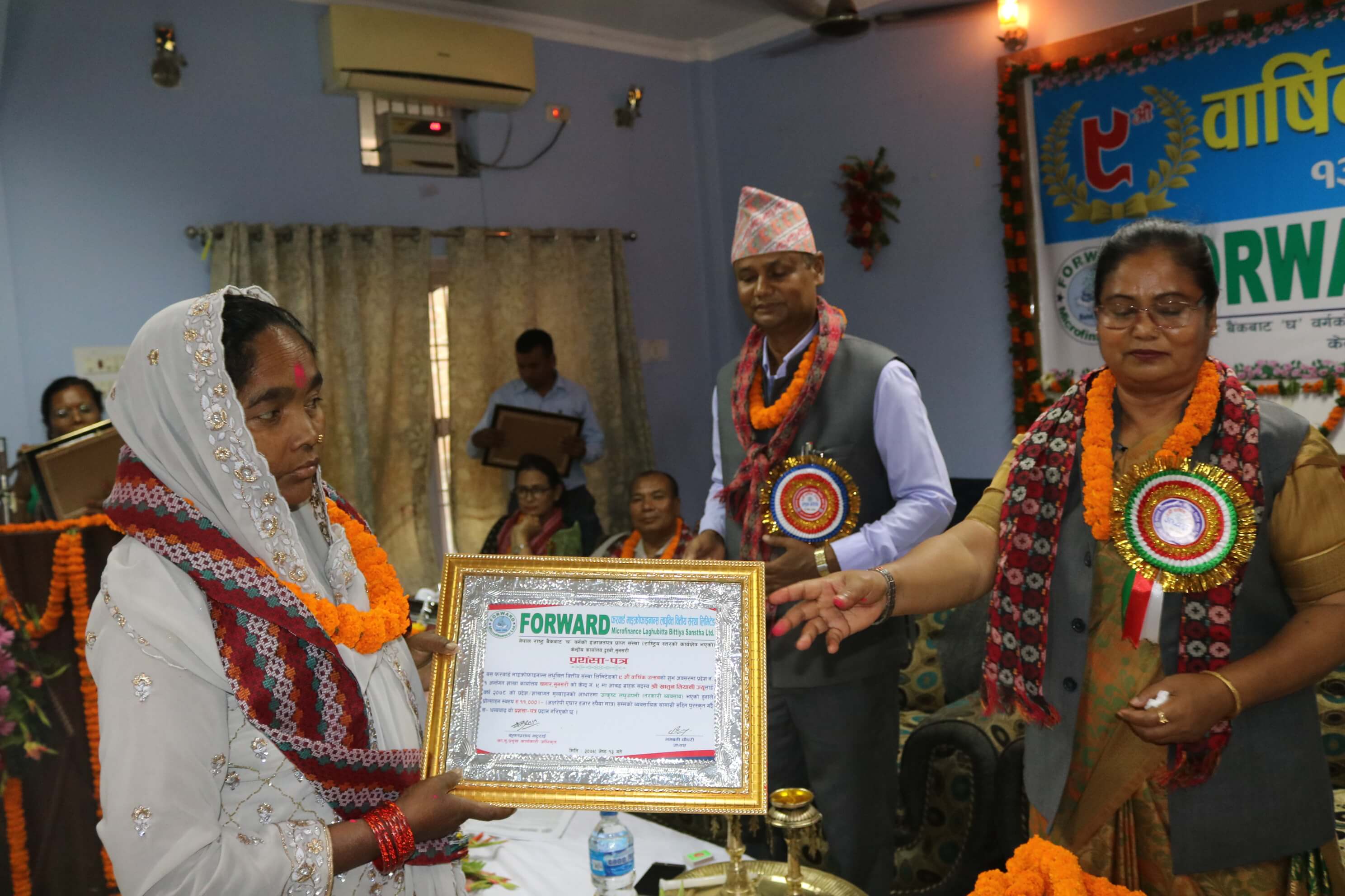 ‘तपाईहरुले पशुपालनमा ऋण लैजानु हुन्छ तर, राम्रो साडी लगाउन, भोजभतेरमा खर्च गर्न थाल्नुभयो भने त्यसले तपाईहरुलाई मात्र हैन ऋण दिनेलाई पनि असर गर्छ । त्यसकारण ऋणको सहि सदुपयोग भने उन्नती प्रगति हुन्छ भएन भने उठिबास लगाउँछ ।’ फरवार्डले उद्यमशिल क्षेत्रमा बढी लगानी गरेको चर्चा गर्दै अध्यक्ष चौधरीले भनिन् ।