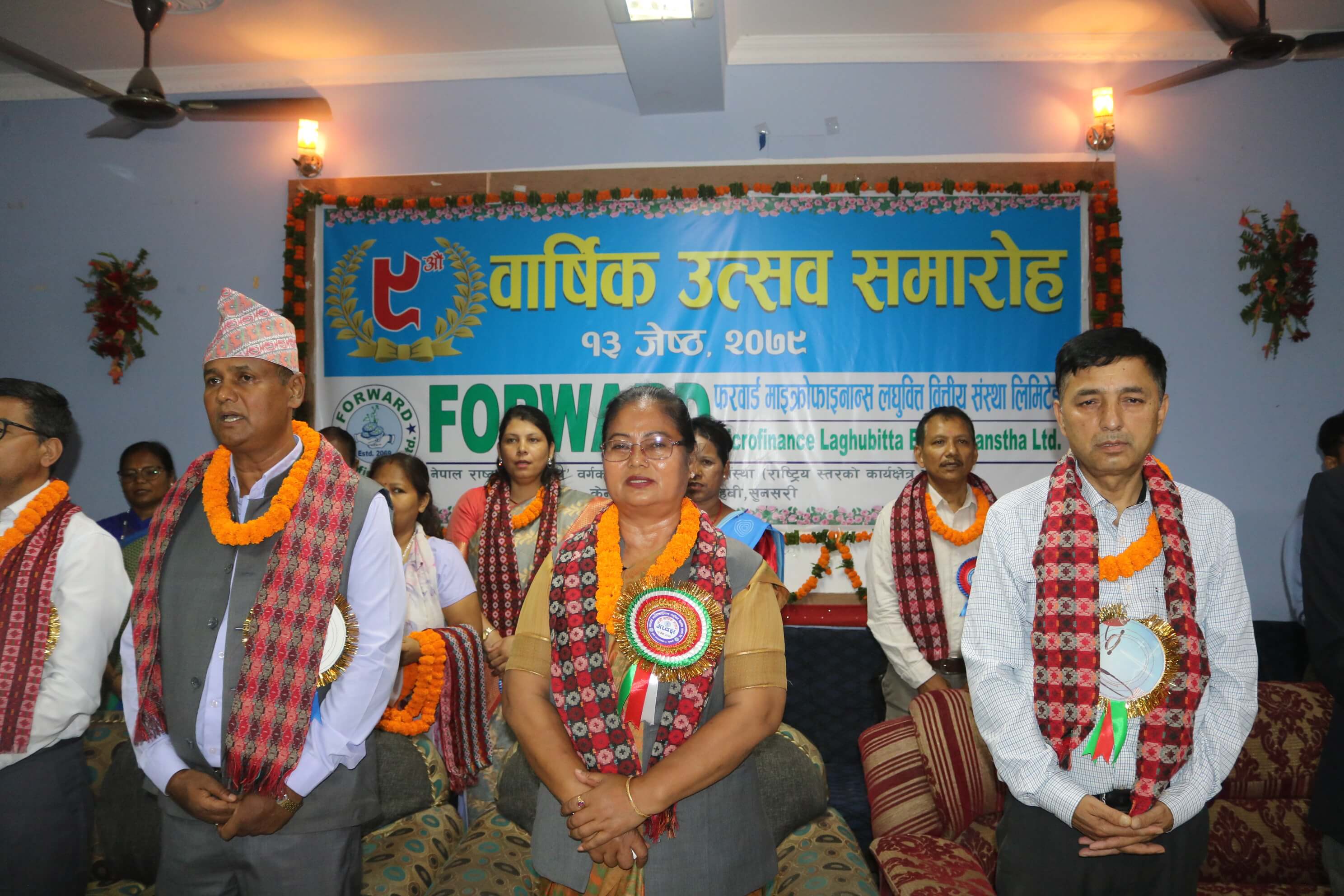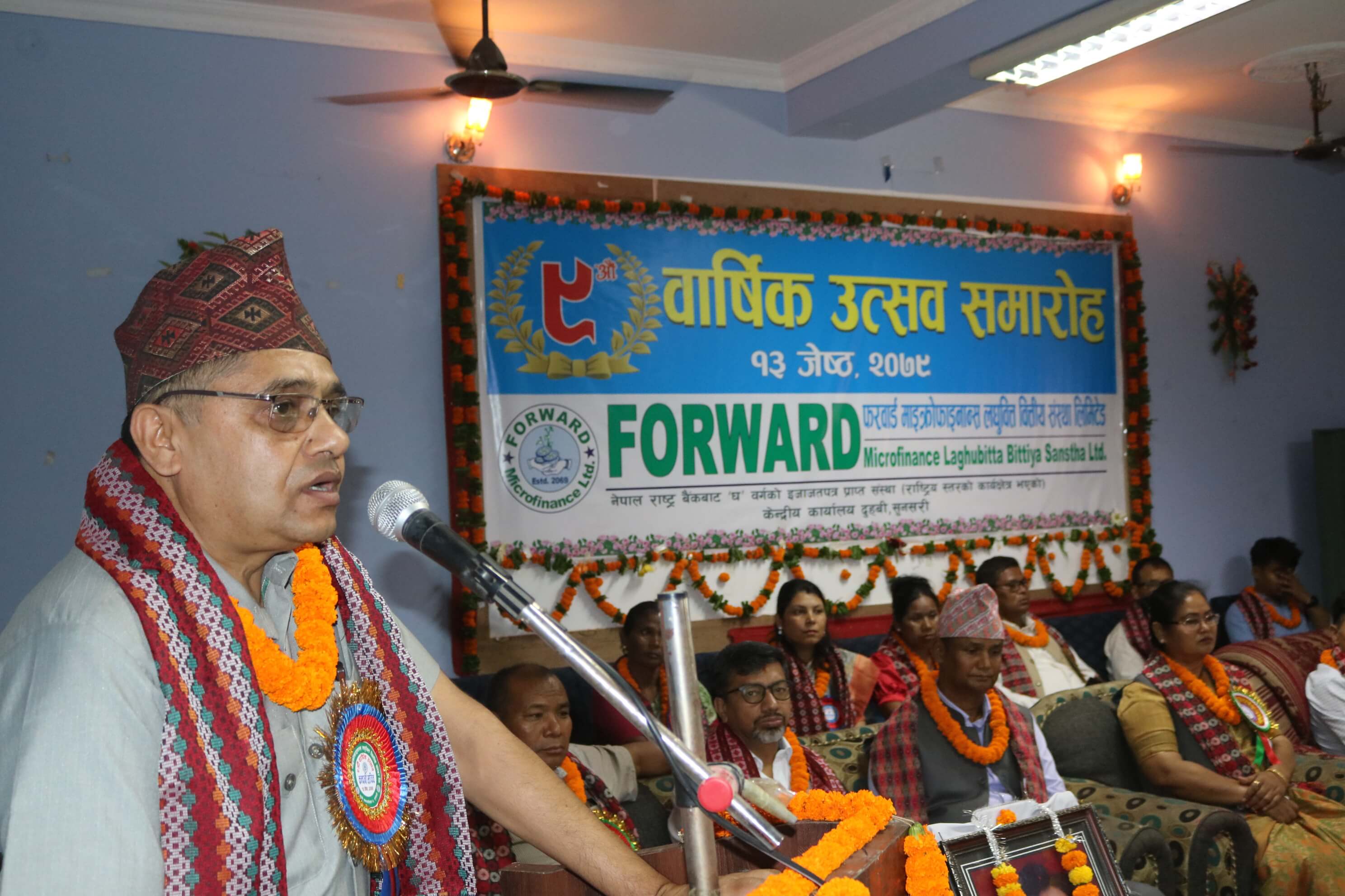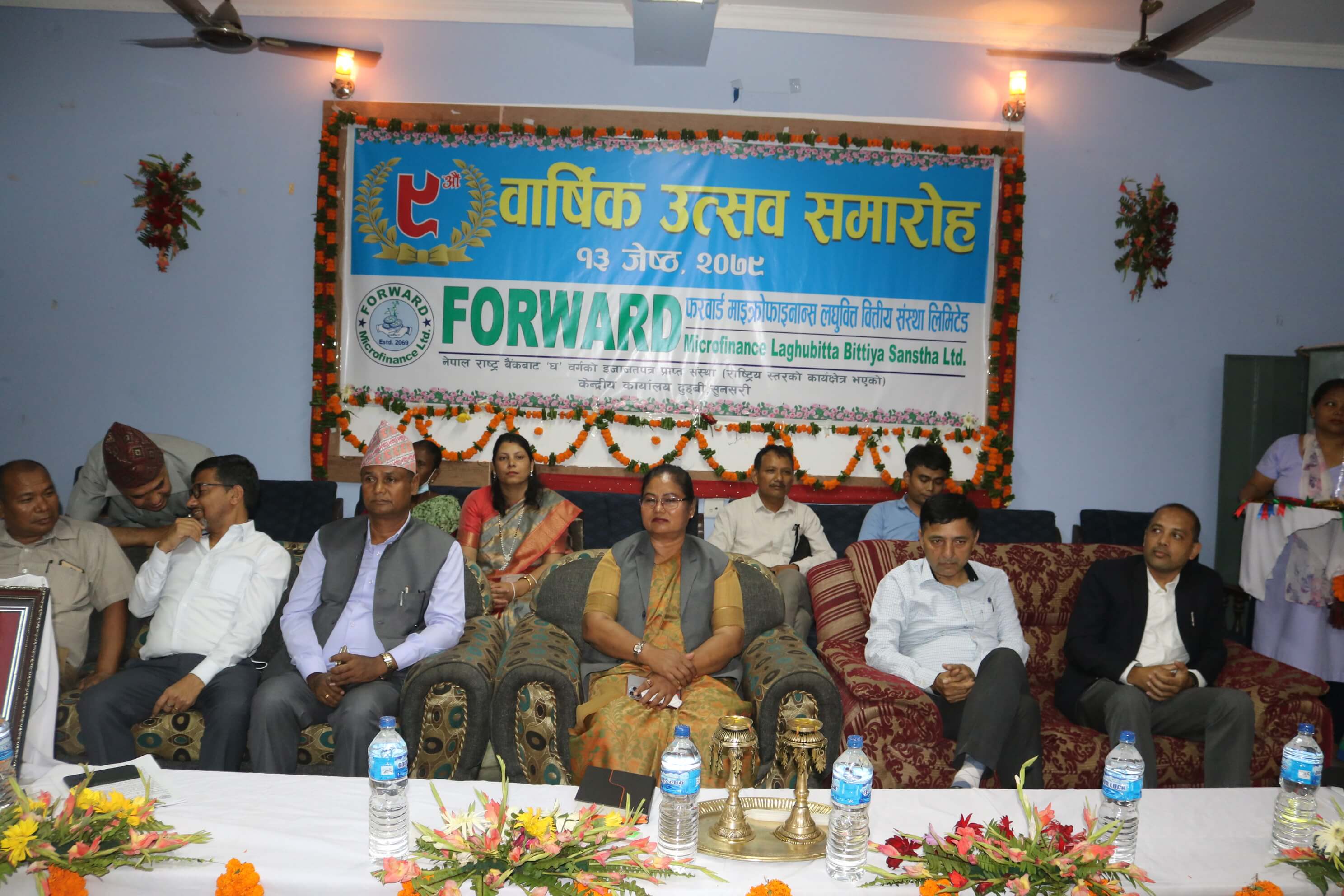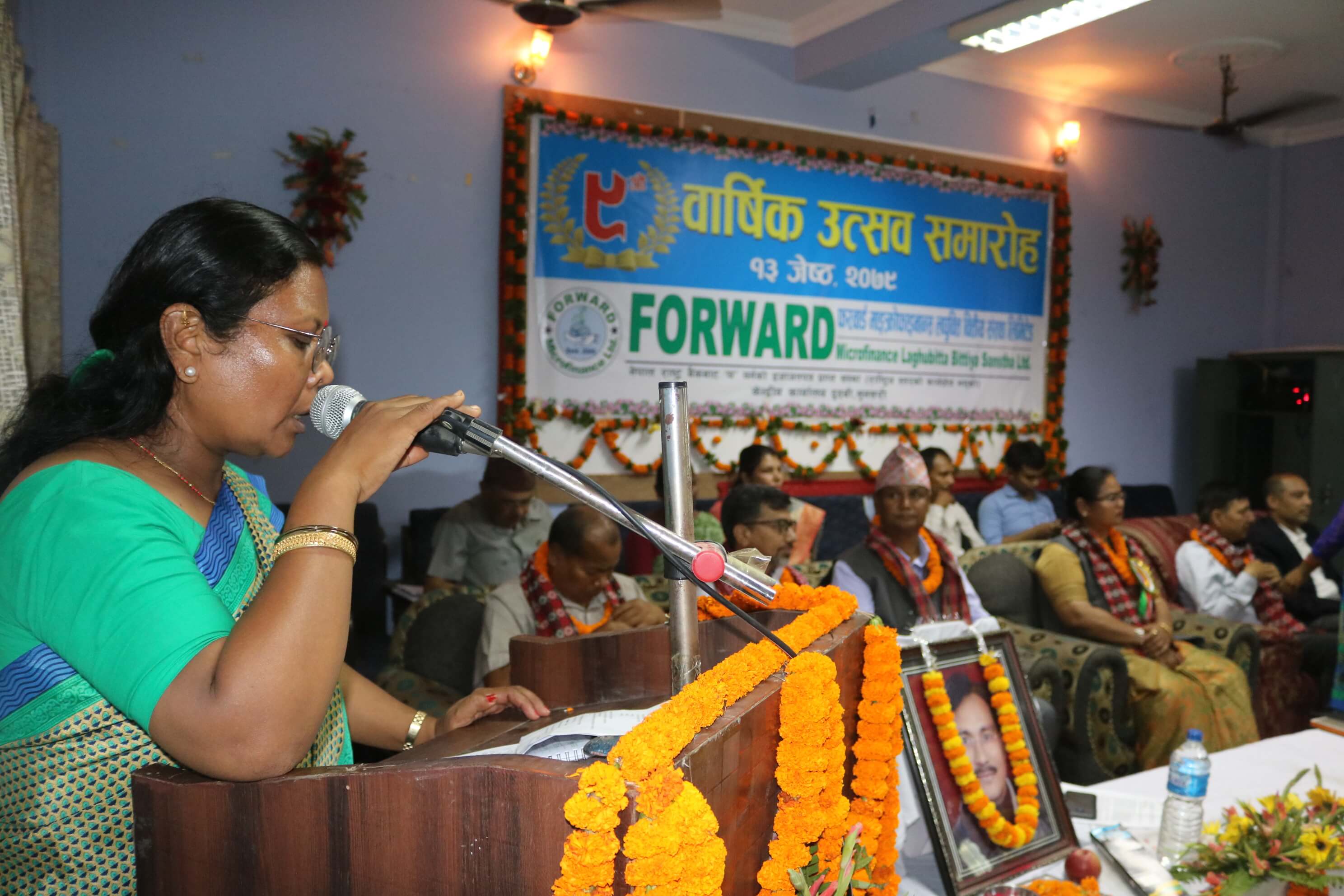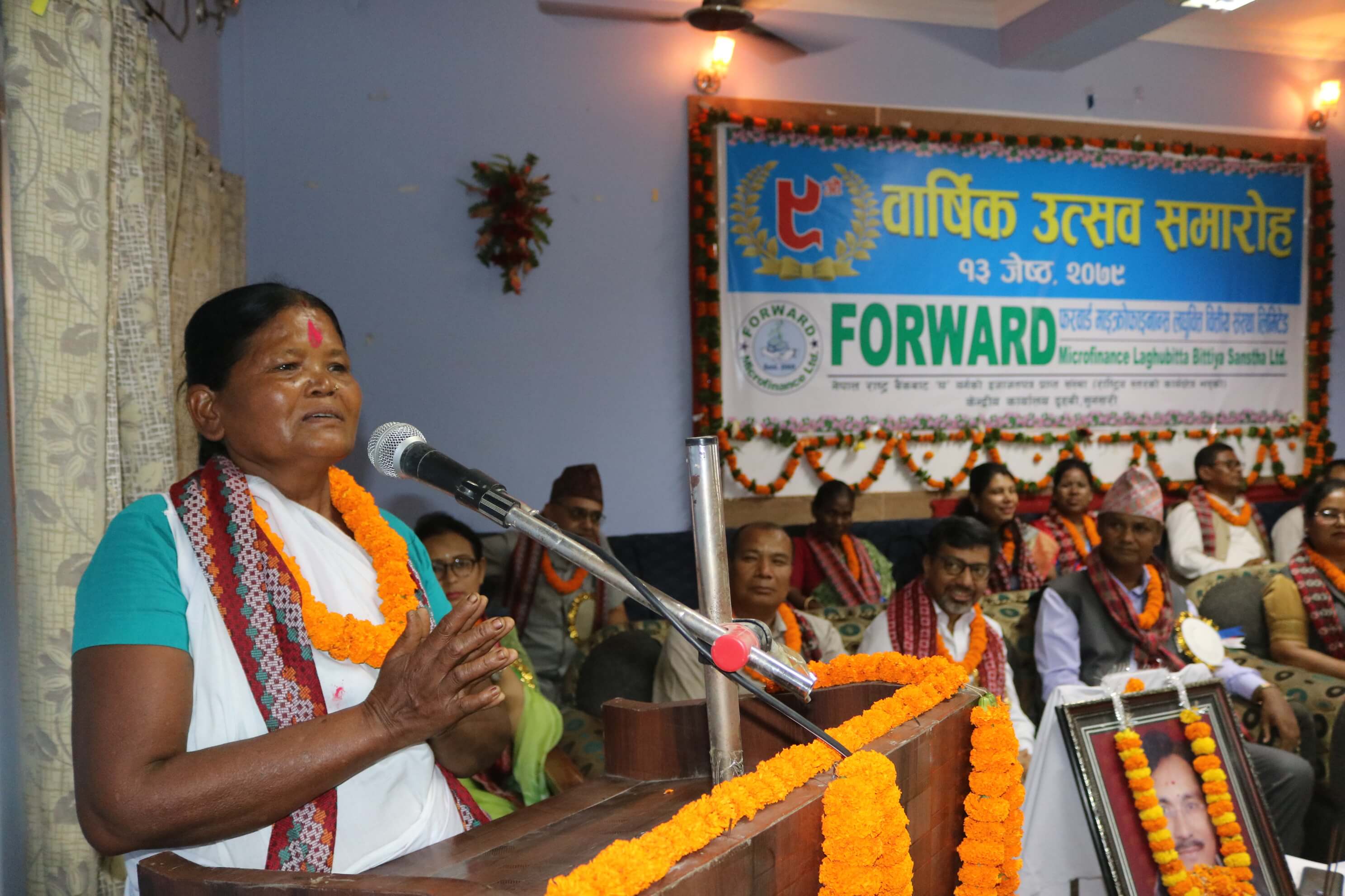 कार्यक्रममा बोल्दै संस्थाकी अध्यक्ष भगवती चौधरीले फरवार्ड माइक्रोफाइनान्सको पोर्टपोलियो बलियो हुनुमा सञ्चालक, कर्मचारी तथा लघुवित्तसँग आबद्ध सबैको महत्वपूर्ण भूमिका रहेको बताइन् । फरवार्ड माइक्रोफाइनान्स स्थापना हुनु अगाडी नै ग्रामिण महिला उत्सुकता विकास मञ्चमार्फत गाउँगाउँमा वित्तीय साक्षरता, महिला सशक्तिकरणका अभियान सञ्चालन गरेकाले फाउण्डेसन तयार भएको बताइन् ।