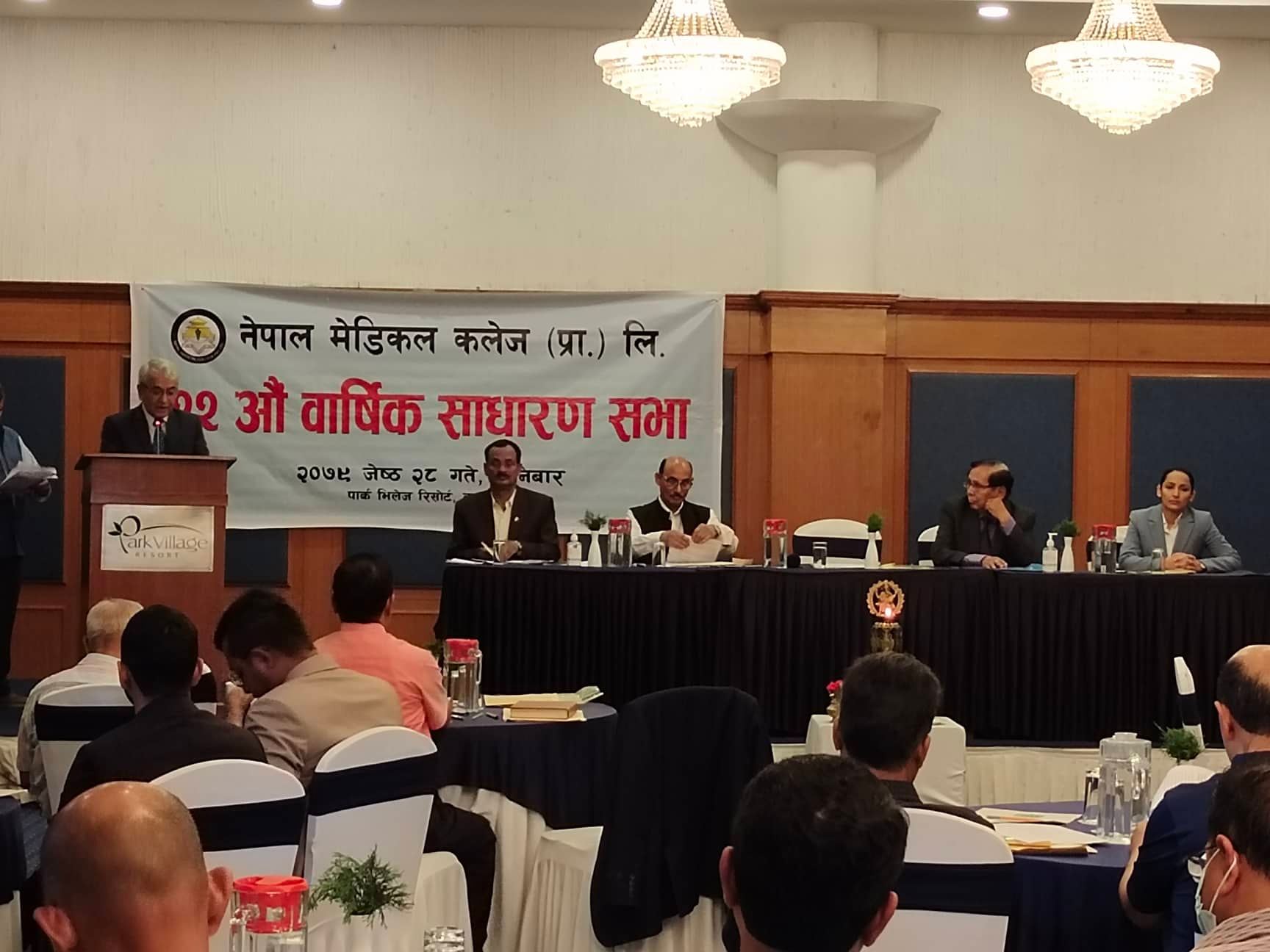 वार्षिक साधारण सभामा उपस्थित सञ्चालक, शेयरधनीहरुलाई स्वागत गर्दै कलेजका सञ्चालक सदस्य प्रा.डा. जैनुद्विन अन्सारीले नेपाल मेडिकल कलेजलाई नेपालकै नमुना स्वास्थ्य संस्था बनाउने अभियानमा आफुहरु रहेको बताए । कलेजलाई सफल र सवल बनाउन सञ्चालक, शिक्षक, कर्मचारी तथा विद्यार्थीको मनोभावना मिल्नुपर्ने जनाउँदै डा. अन्सारीले कलेजको उद्देश्य प्राप्तिमा सबैले आ–आफ्नो भूमिका इमान्दारिताका साथ निर्वाह गर्नुपर्नेमा जोड दिए ।