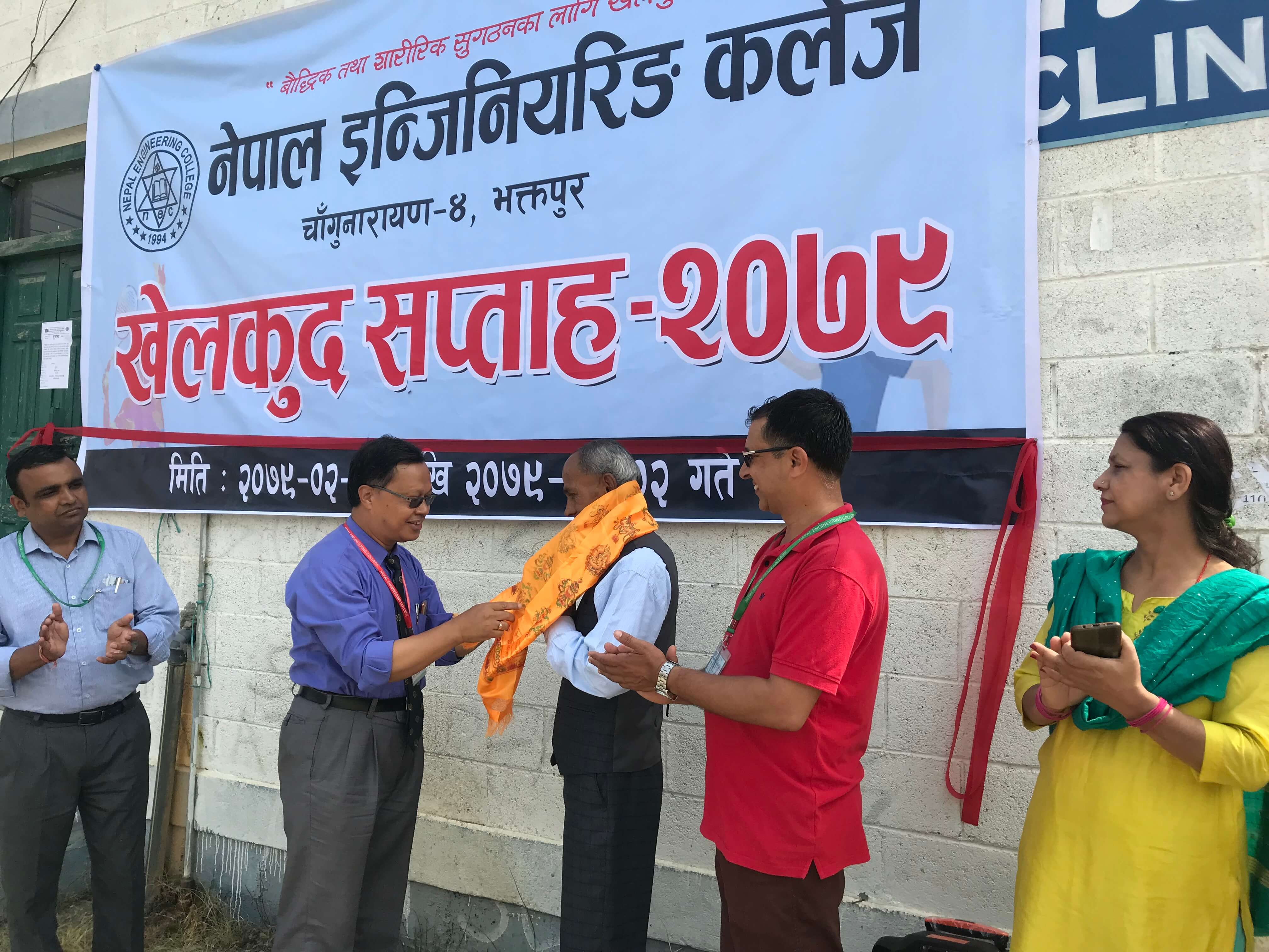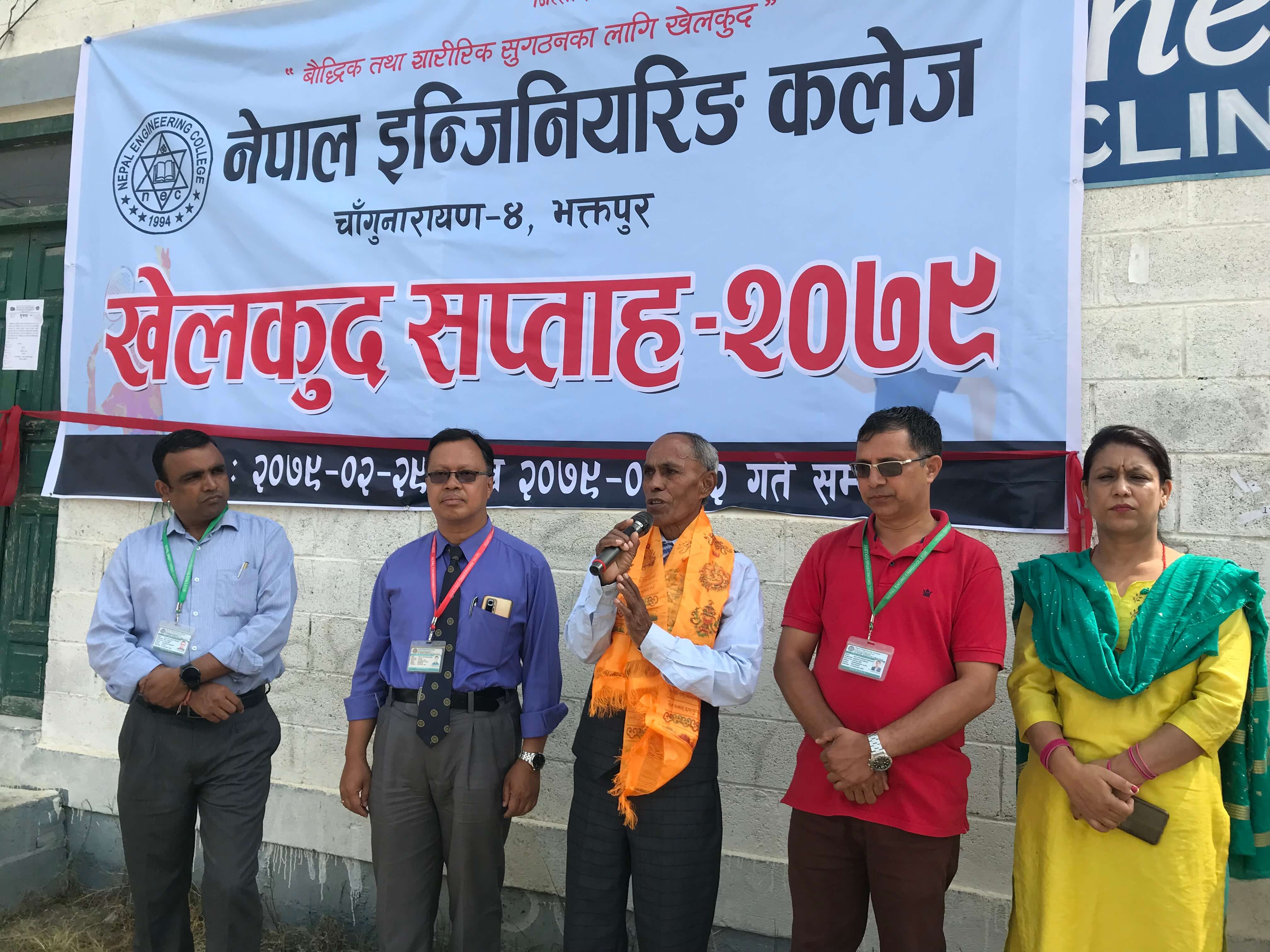भक्तपुर । नेपाल इन्जिनियरिङ कलेजमा खेलकूद सप्ताह सुरु भएको छ । आजबाट सुरु भएको खेलकूद सप्ताह नेपालका प्रमुख अतिथि किर्तिमान पदकधारी म्याराथुन खेलाडी बैकुण्ठ मानन्धर, कलेजका प्रिन्सिपल प्रा.डा. हरिकृष्ण श्रेष्ठ लगायतले उद्घाटन गरेका छन् ।
