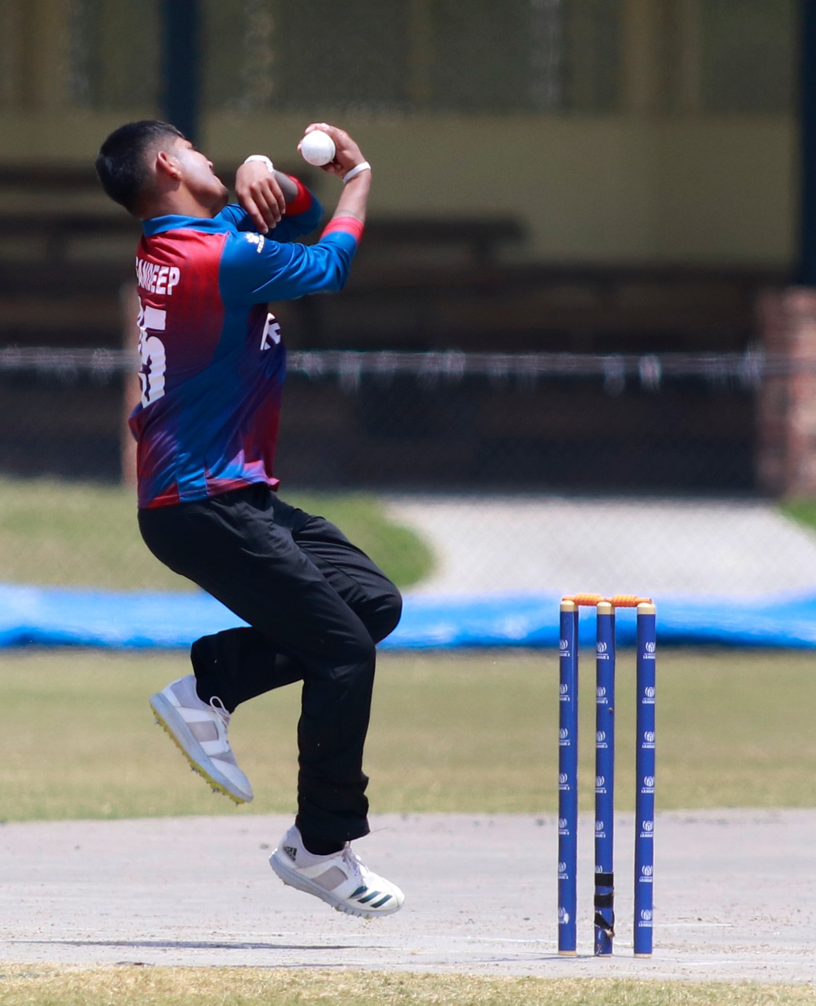 नेपालका कप्तान सन्दीप लामिछानेले सर्वाधिक चार विकेट लिए । किफायती बलिङ गरेका सन्दीपले १० ओभरमा ३ भन्दा तलको इकोनोमीसहित २९ रन मात्र खर्चिए । सोमपाल कामीले र दीपेन्द्रसिंह ऐरीले समान दुई विकेट लिँदा बसिर अहमदले एक विकेट हात पारे ।